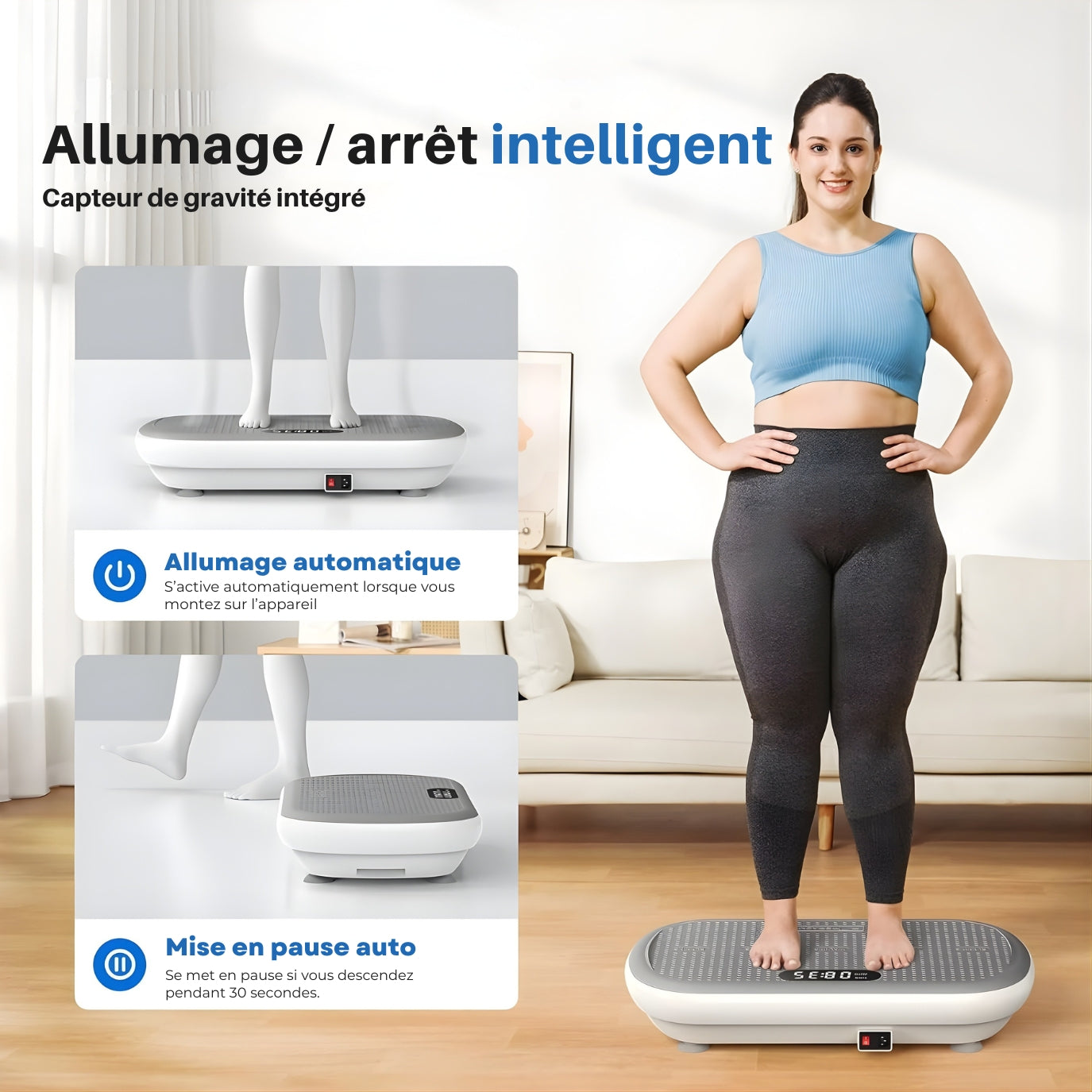Tu montes sur la planche, tu choisis une intensité et les vibrations font travailler les muscles. Les 3 zones te guident : Activation (0–40), Cardio (41–80), Intensité (81–120).